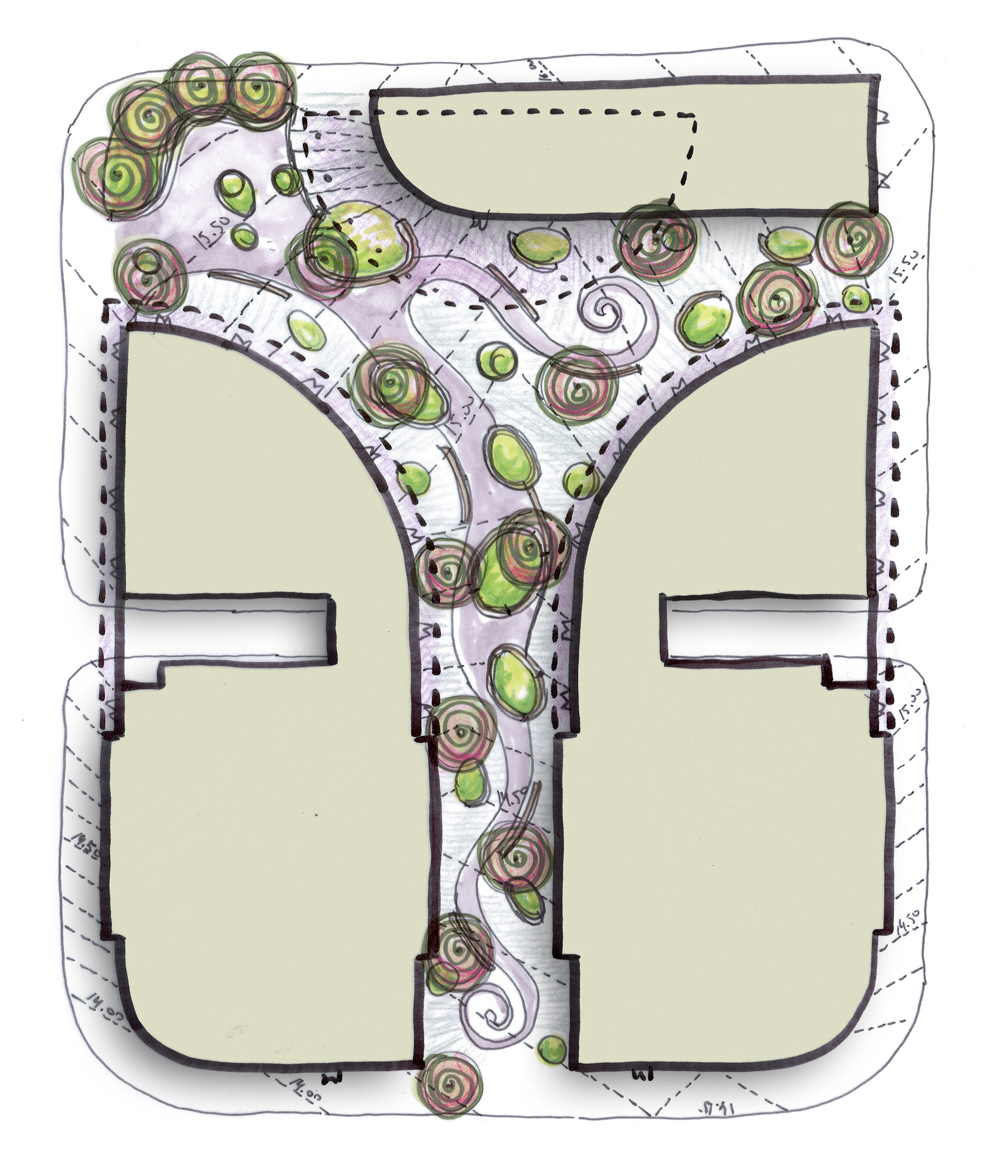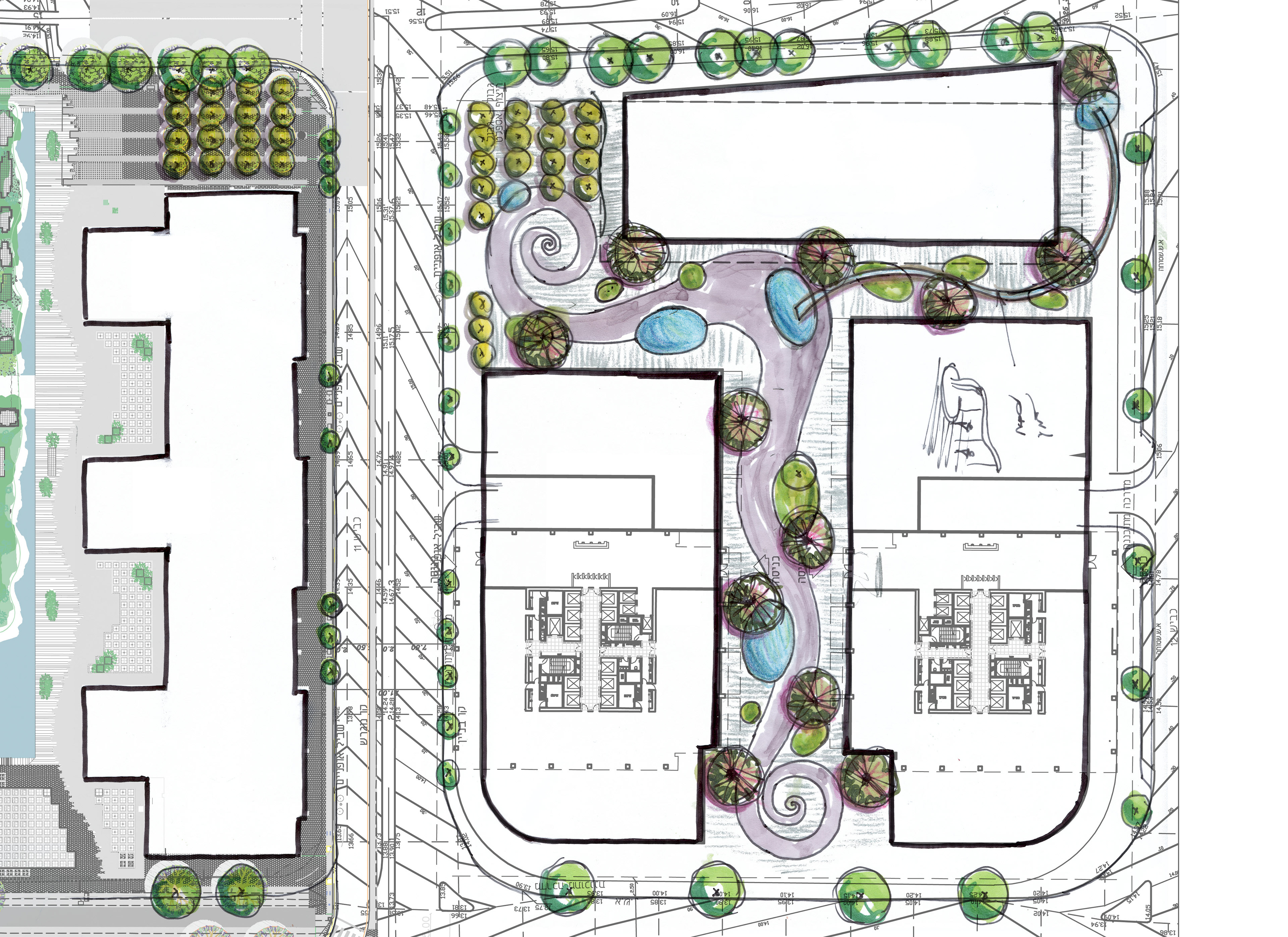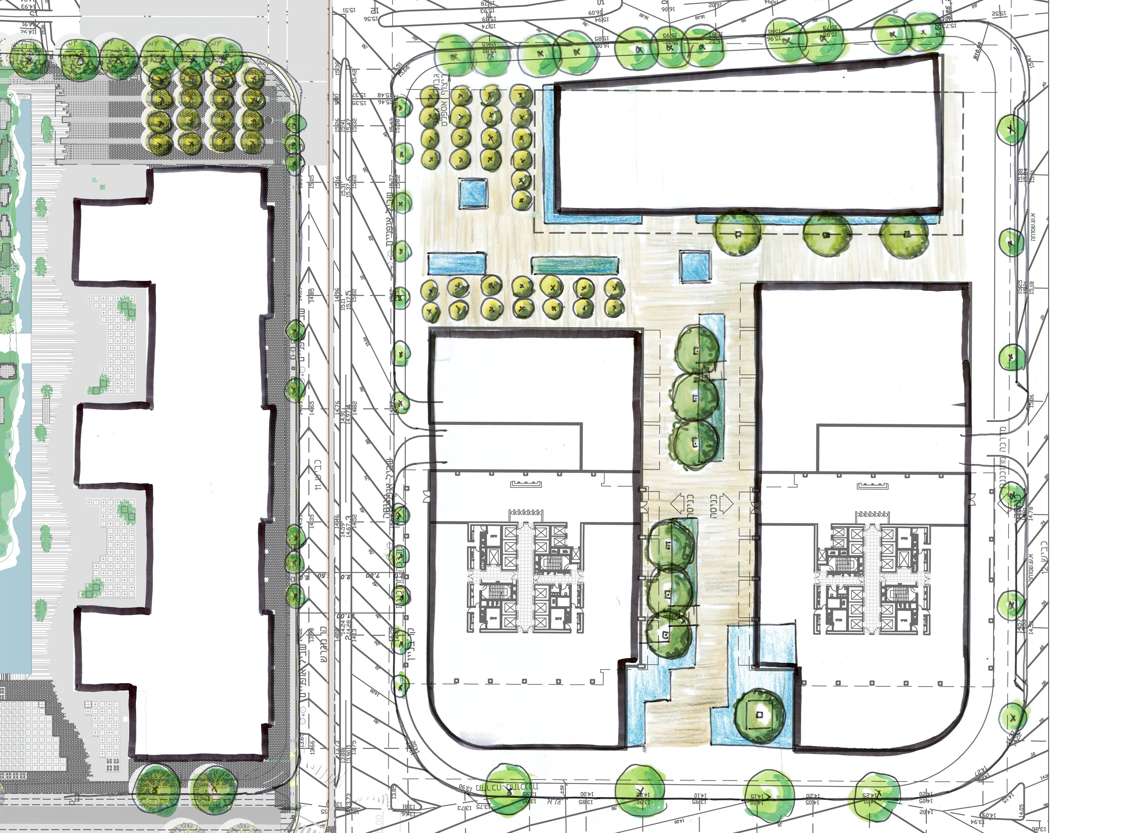 Yigal Alon Street runs alongside the Ayalon River, which, although channelled and barely perceptible today, continues to shape the urban structure of the area. The Bitzaron master plan draws on ideas of water and flow as a generator of movement and spatial organisation.