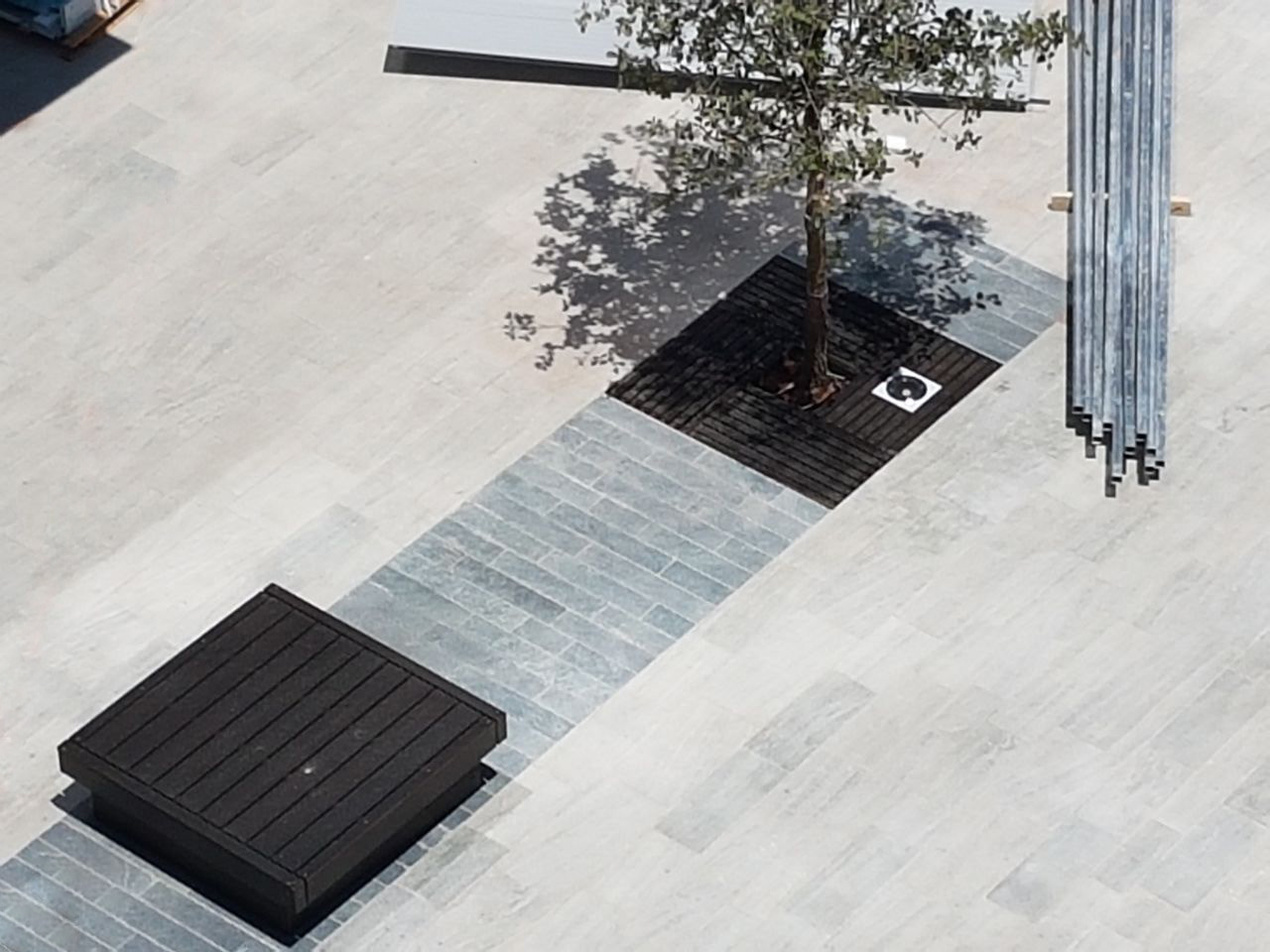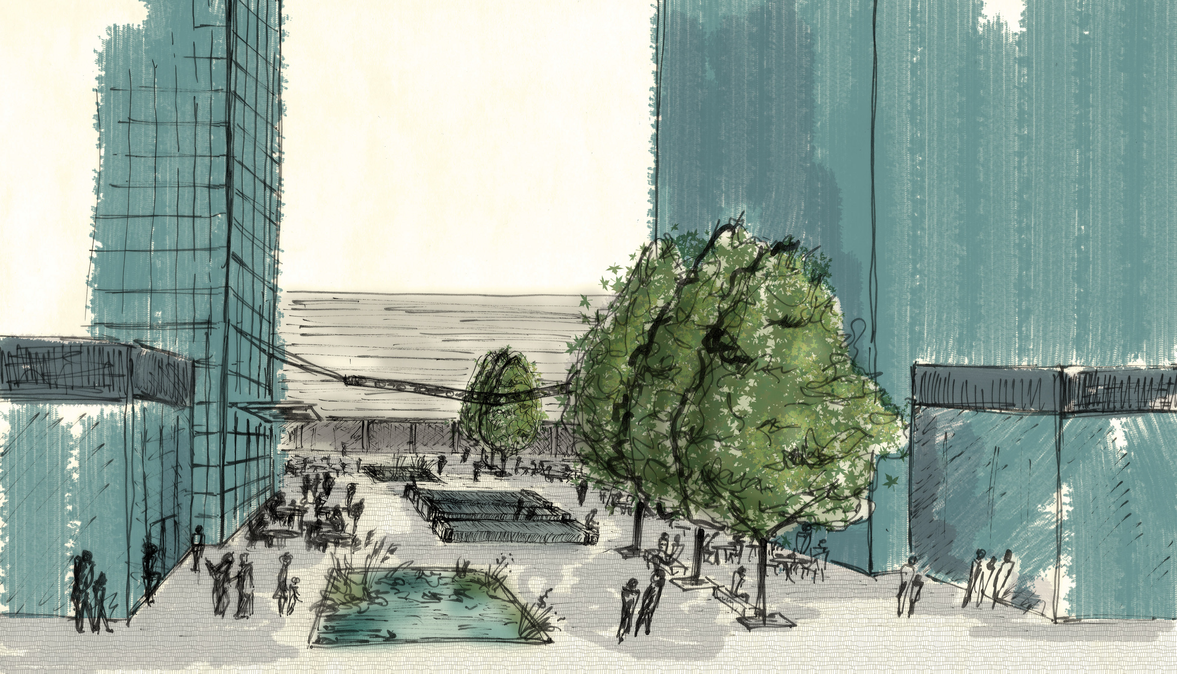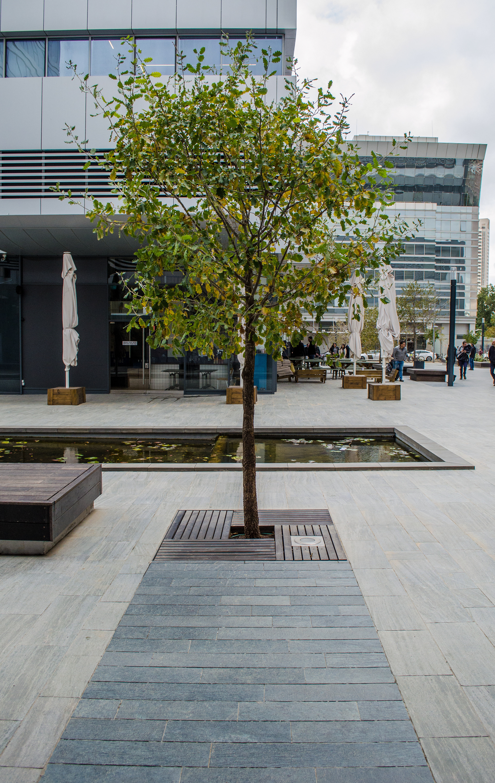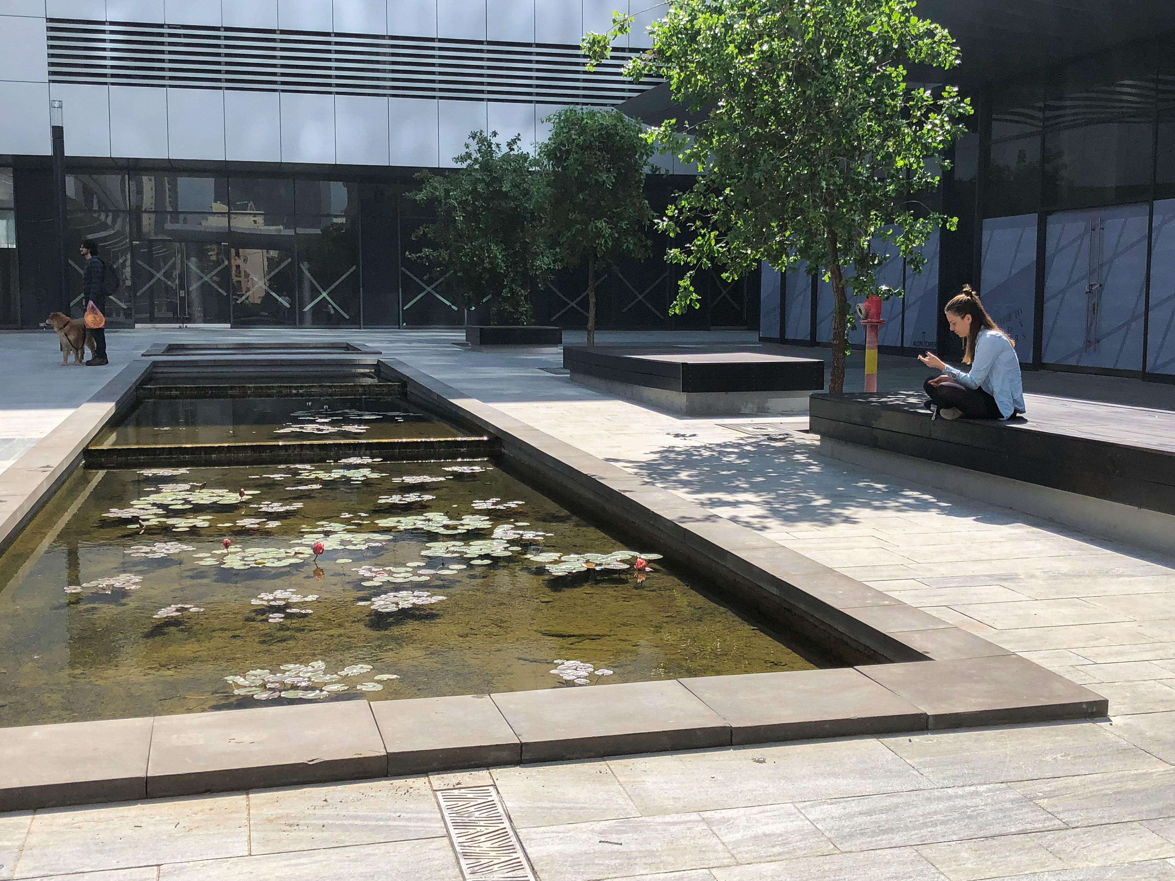 When thinking about the thousands of people moving through the Alon Towers business centre each day, I wanted to create a landscape that offered a counterpoint to that grinding daily intensity. Rather than amplifying movement and speed, the ground plane was designed to encourage pause and introduce moments of calm. The idea of a slow-moving stream informed the sequencing of spaces, material transitions, and the overall rhythm of the public realm. While the landscape introduces colour, rhythm, and opportunities to slow down, its visual language remains intentionally urban and orthogonal, responding to the architectural context of the towers.