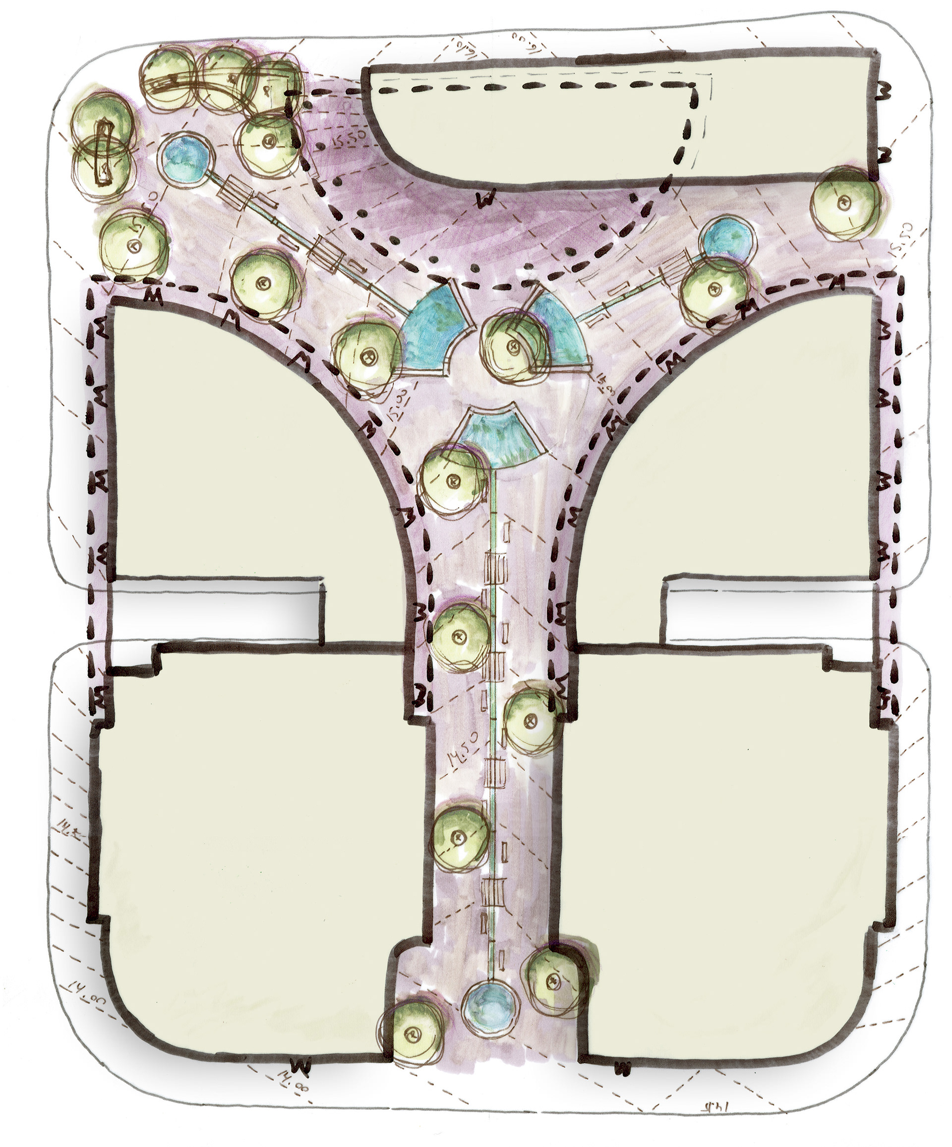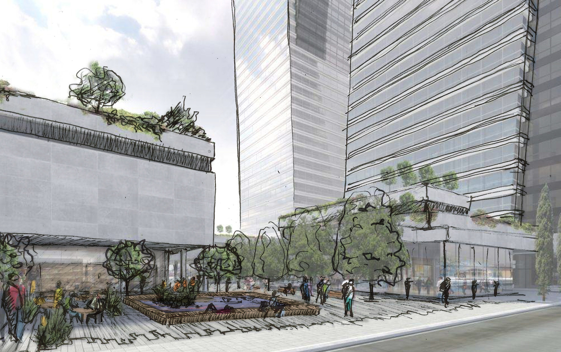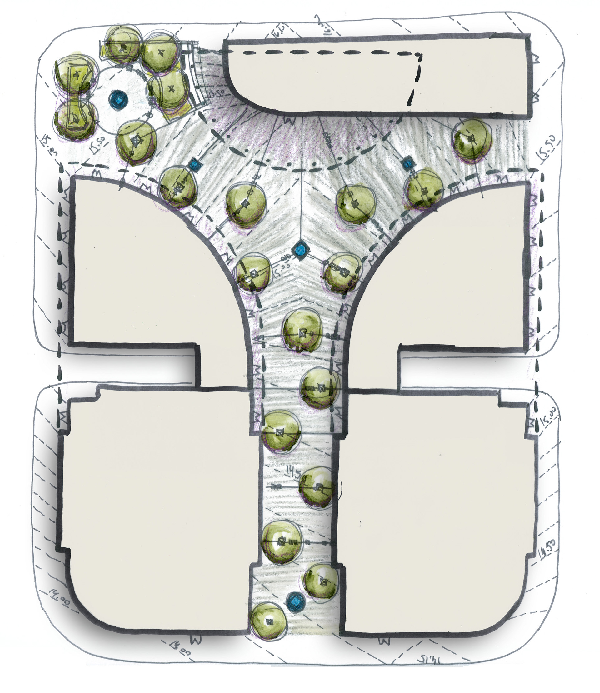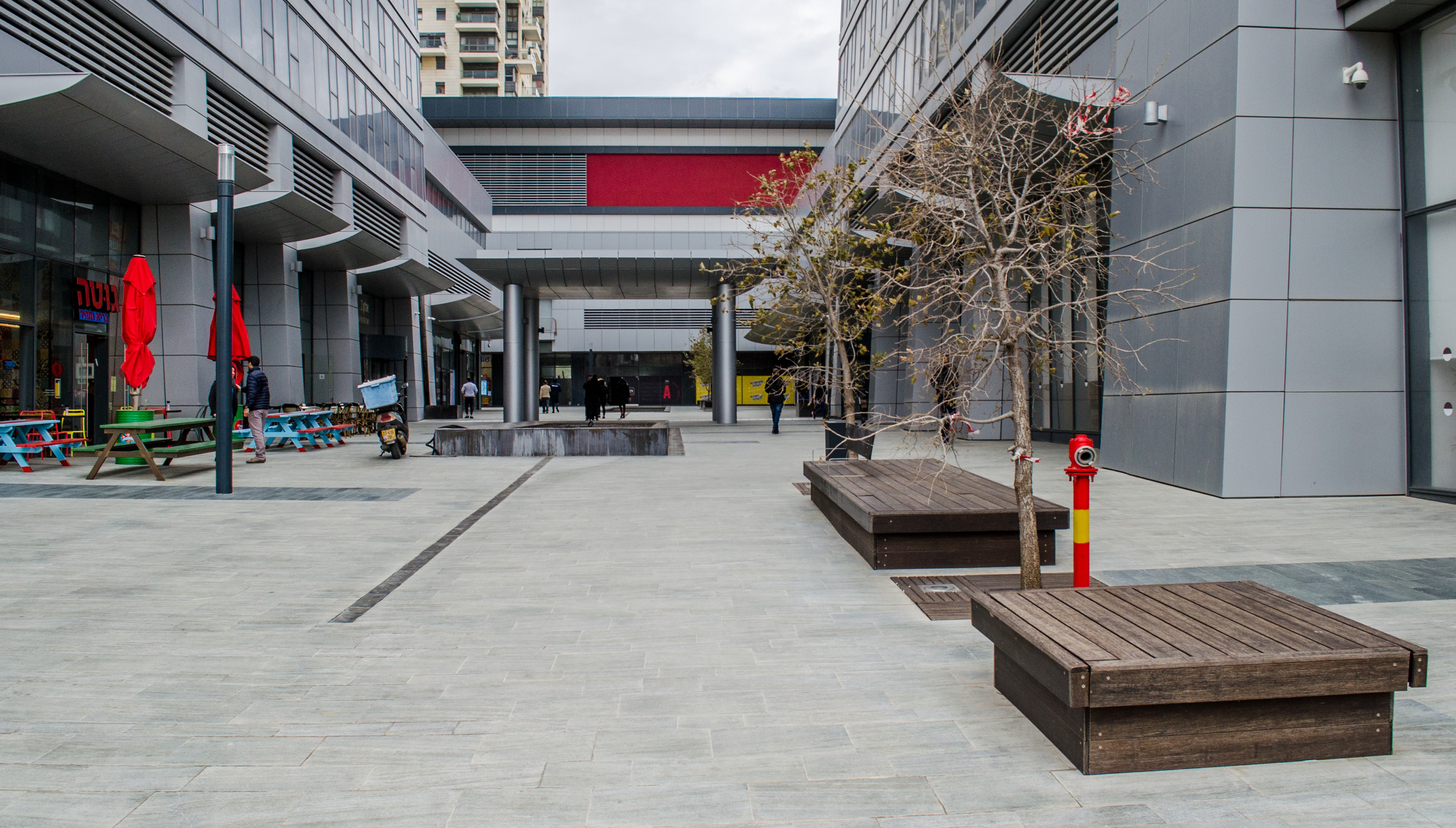 When thinking about the thousands of people moving through the Alon Towers business centre each day, I wanted to create a landscape that offered a counterpoint to that grinding daily intensity. Rather than amplifying movement and speed, the ground plane was designed to encourage pause and introduce moments of calm. The idea of a slow-moving stream informed the sequencing of spaces, material transitions, and the overall rhythm of the public realm. While the landscape introduces colour, rhythm, and opportunities to slow down, its visual language remains intentionally urban and orthogonal, responding to the architectural context of the towers.