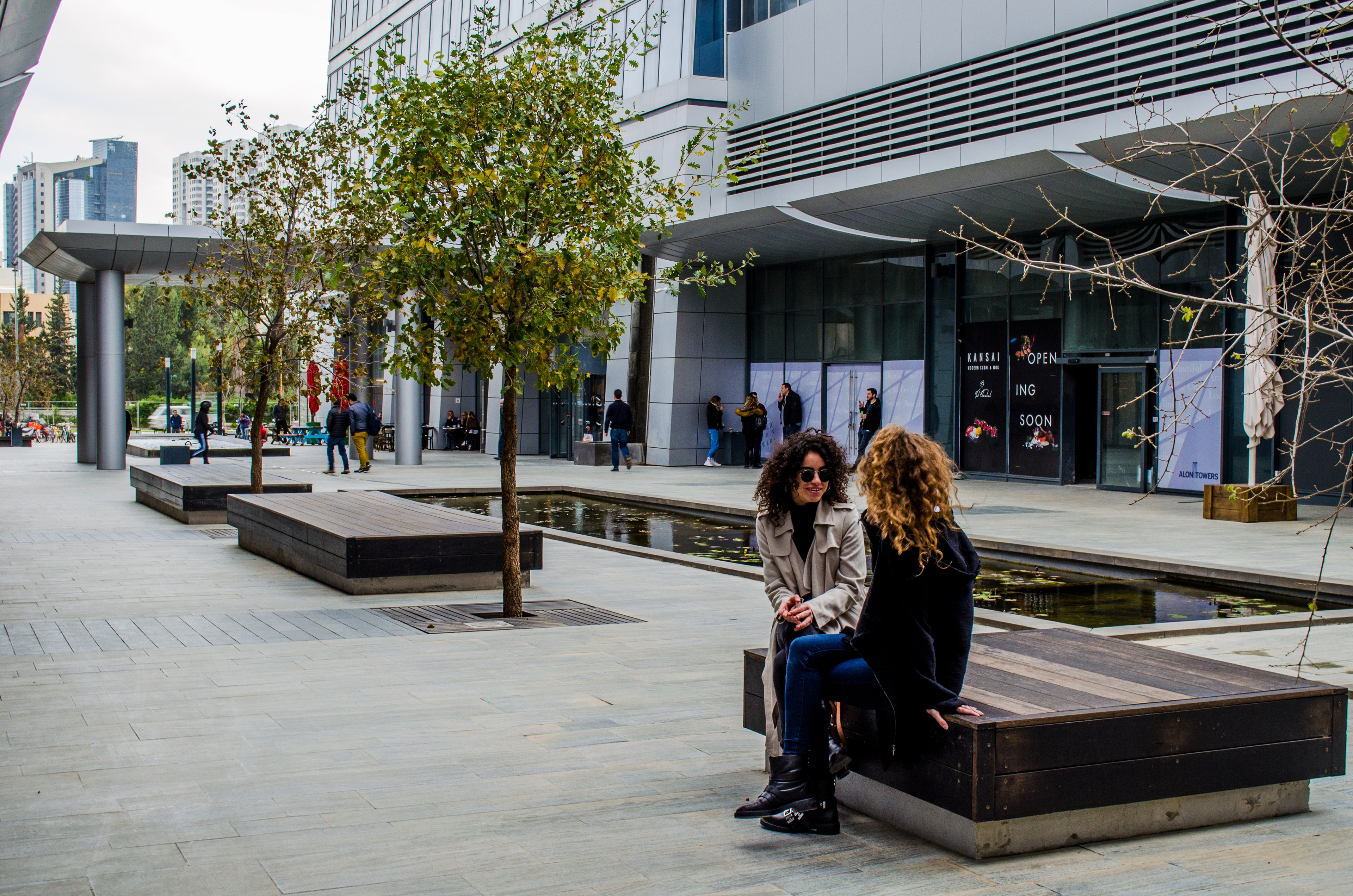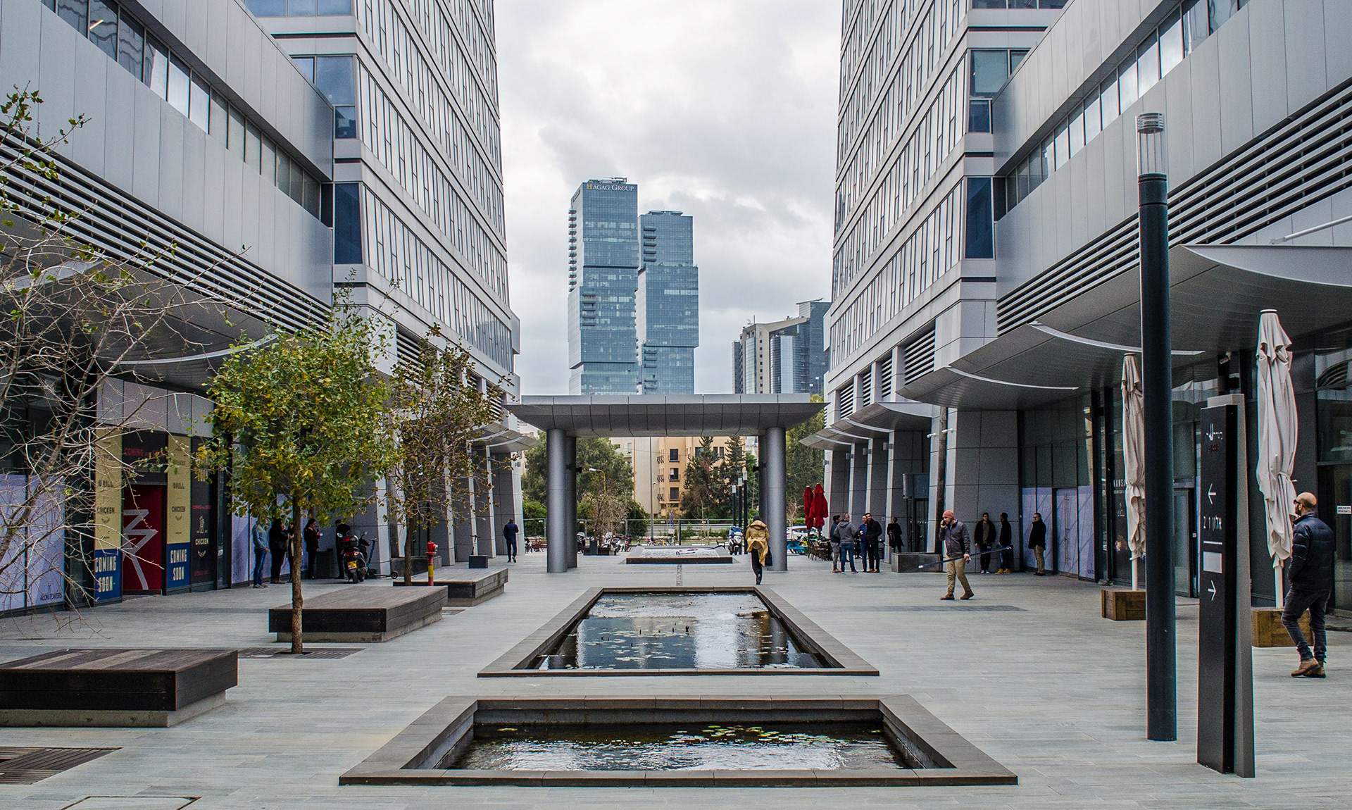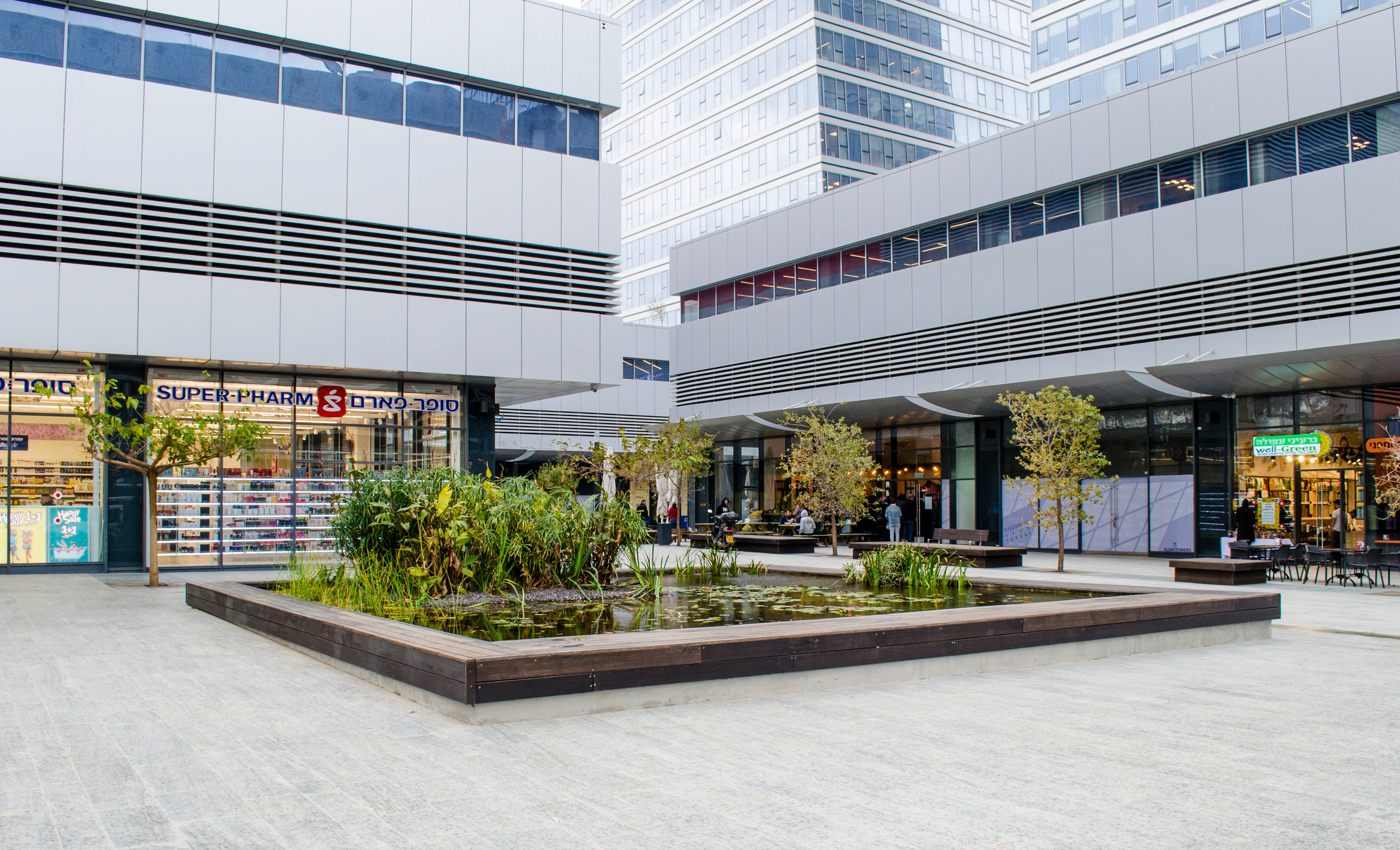 Alon Towers is a mixed-use business complex in Tel Aviv’s Bitzaron neighborhood along Yigal Alon Street. It features two 45-story office towers above a retail podium and a two-story public building housing the 'Tmuna' theater. The complex sits atop several levels of underground parking, with ground-level exits to the east and west. The landscape design spans both ground-level public spaces and rooftop areas atop the retail podium and theatre. The entire complex sits atop several levels of underground parking, with ground-level exits on the east and west sides.