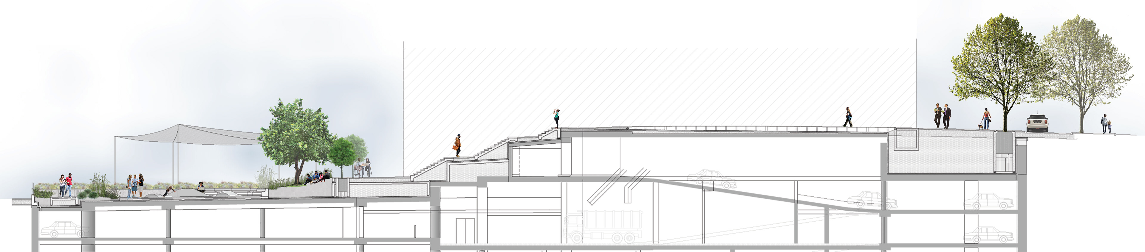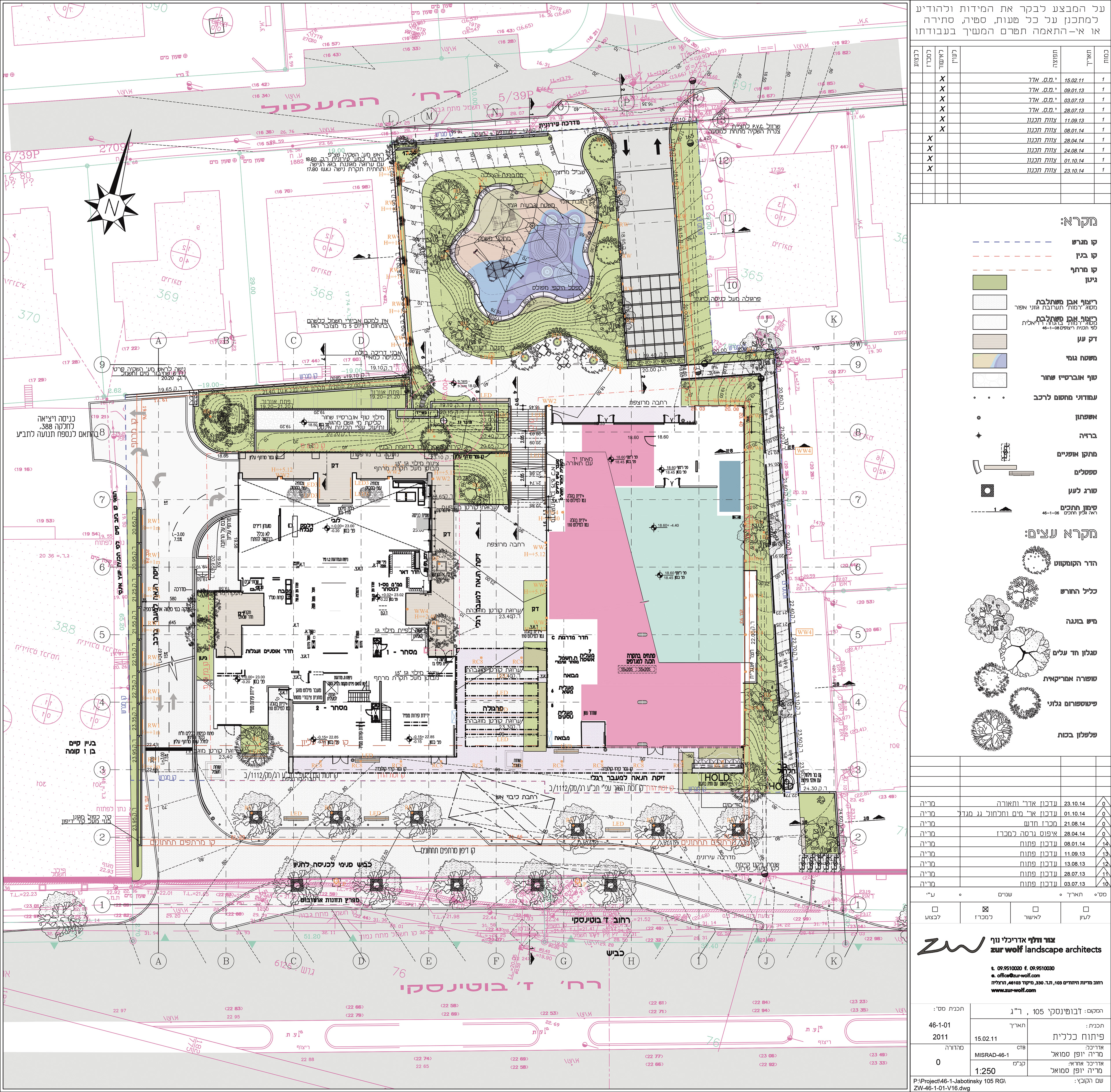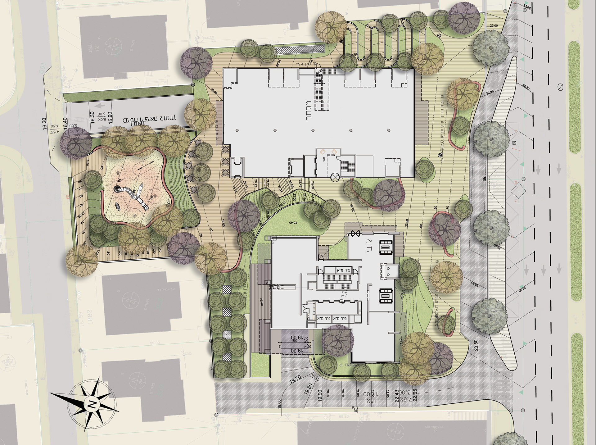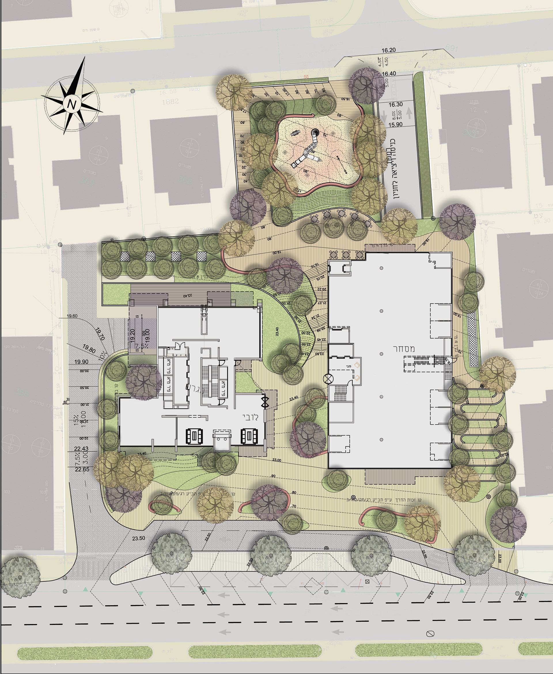 The project was formed around the passage between the two streets: at the bottom is a small playground, in the mid-level is a shaded area with a cafe and a synagogue entrance and at the top is wide sidewalk of Jabotinsky st.