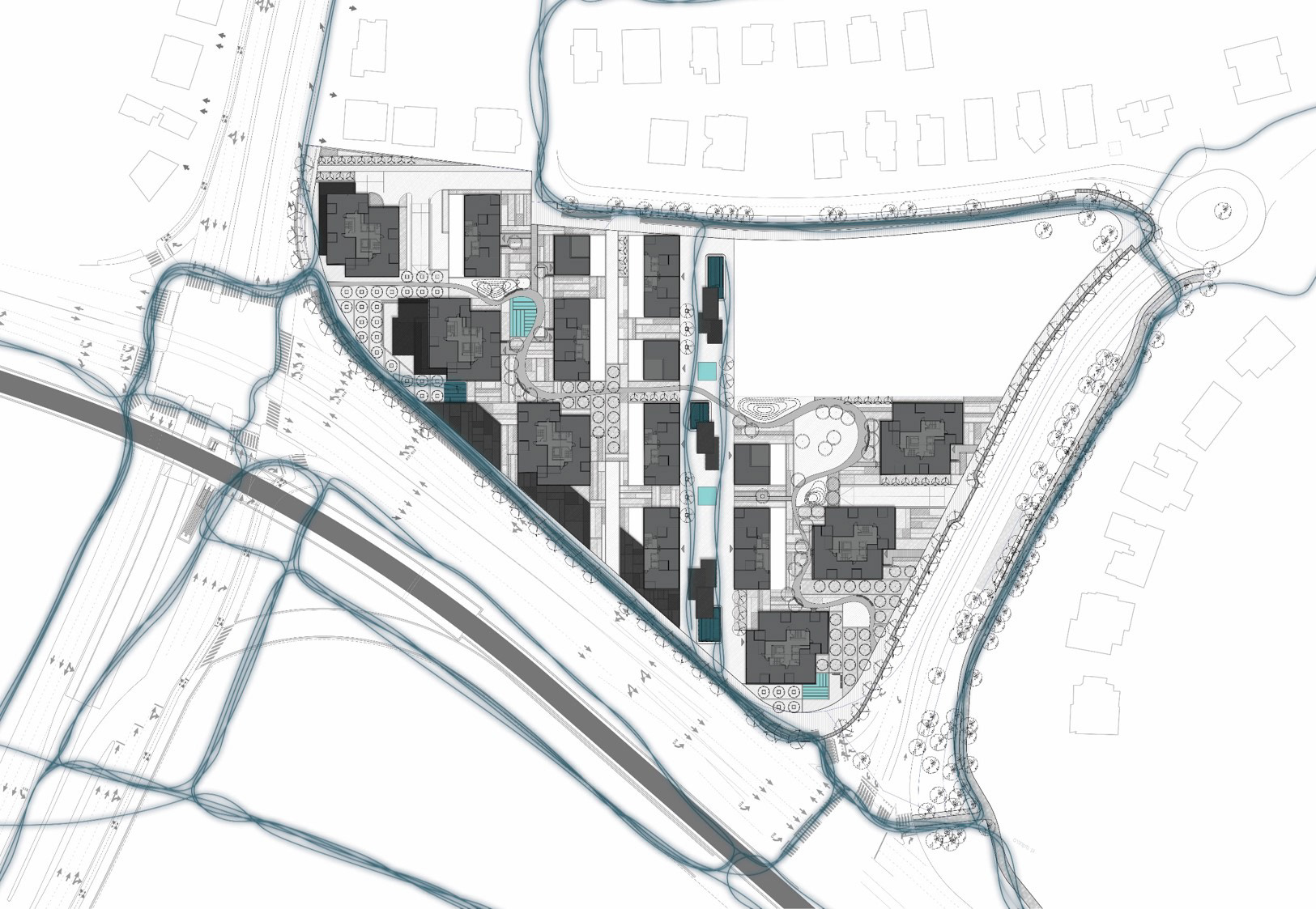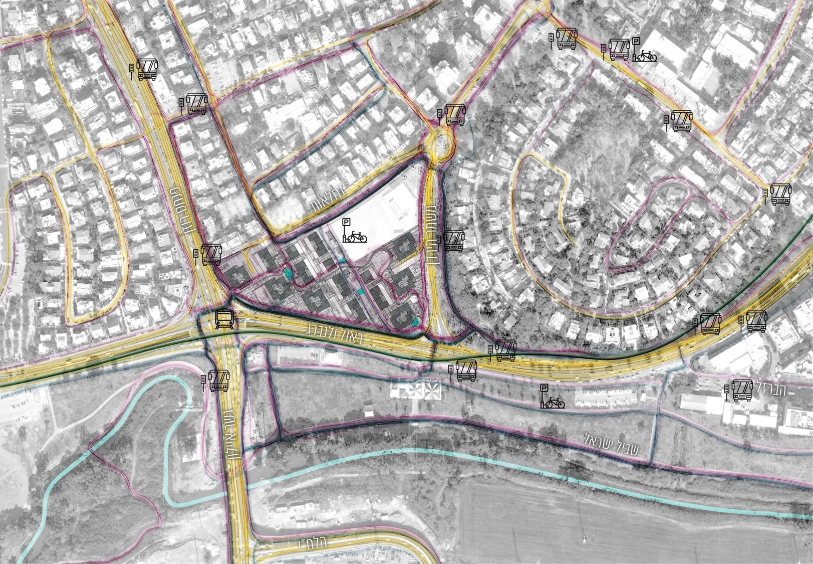 If you zoom out and look , you'll find that the future Dan development is situated in an idyllic place - banks of Yarkon river, engulfed by city from one side and agriculture from another- unfortunately, it is very hard to tell when on the ground mainly due to the major motorways surrounding it. While making great efforts to overcome this obstacle and enhance the connectivity by means of crossings, bridges and visual vistas, the design also draws from those original strong elements - city, agricultural landscape and river; and uses them as a story line to create a micro world for the community of future residents.