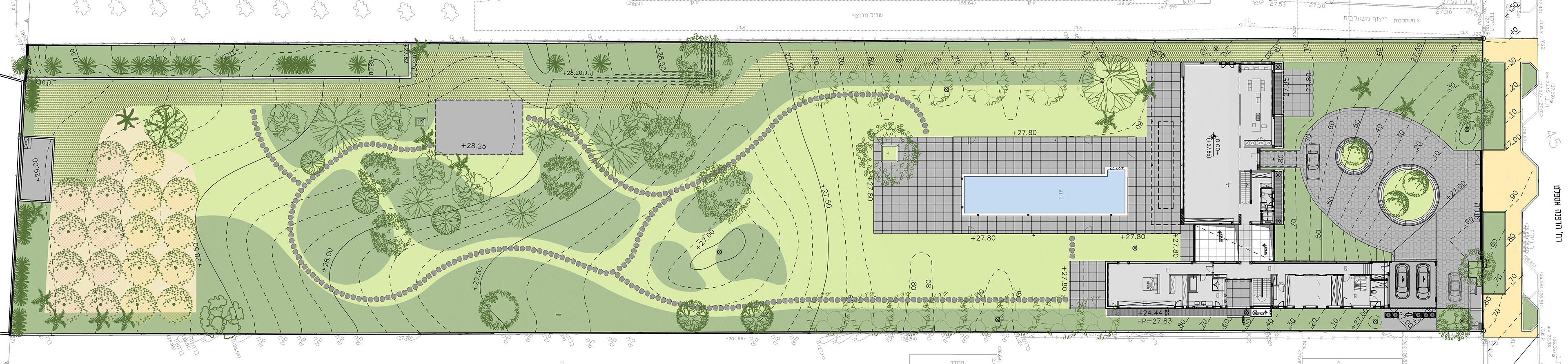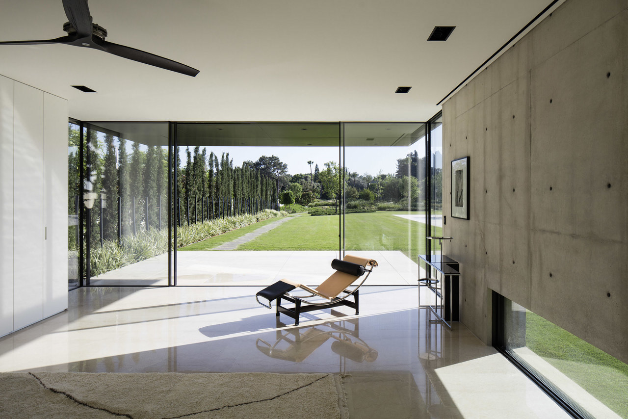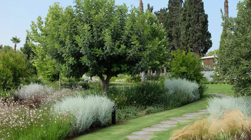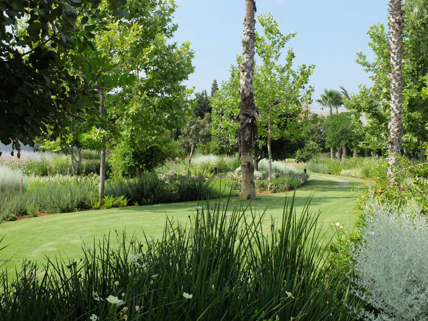 Zilber Residence is a private residence garden in Rishpon, an agricultural village gradually transforming into a high-end residential use. Initially, the owners wished to complement the contemporary design of the house with a 6,000 sqm flat lawn surrounded by exposed concrete walls, despite the presence of an old stable and approximately 30 mature trees on site.