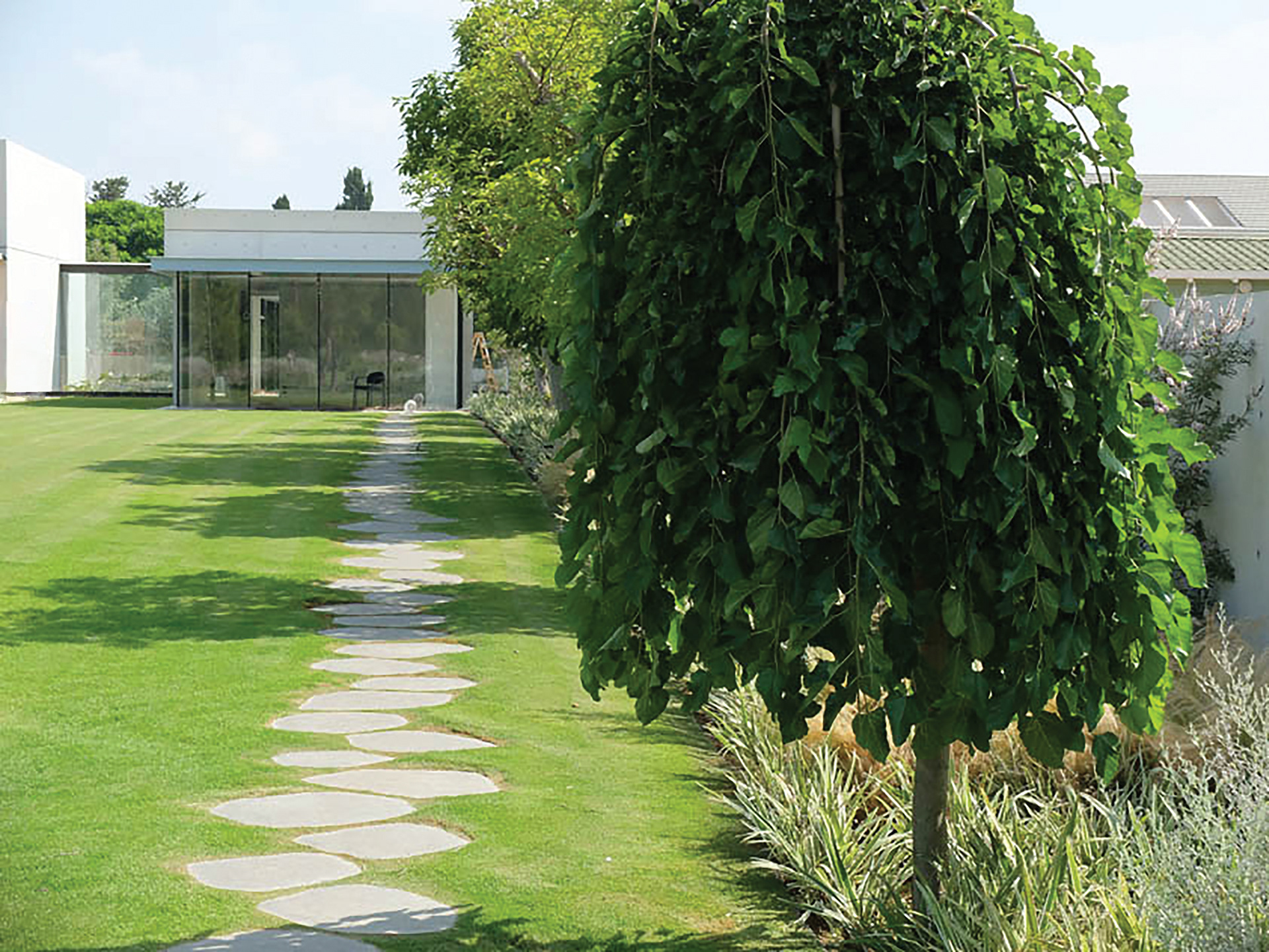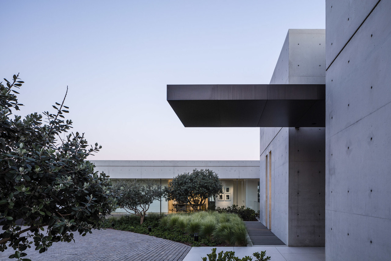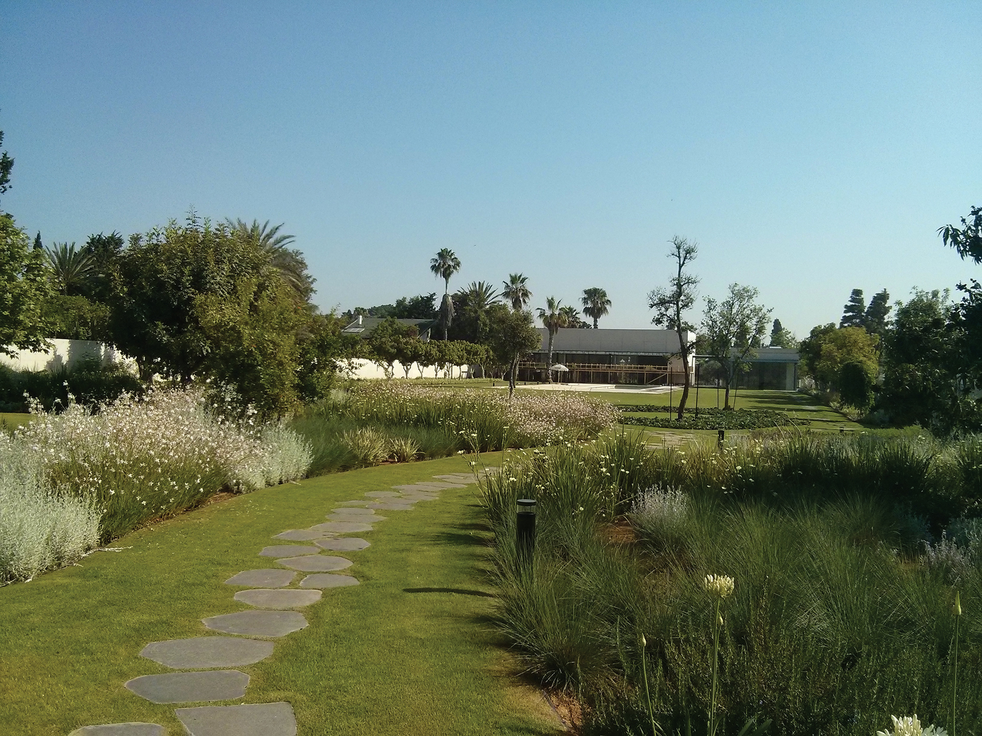 Zilber Residence is a private residence garden in Rishpon, an agricultural village gradually transforming into a high-end residential use. Initially, the owners wished to complement the contemporary design of the house with a 6,000 sqm flat lawn surrounded by exposed concrete walls, despite the presence of an old stable and approximately 30 mature trees on site.